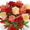 17 роз: роза красная - 7 шт.(70см), роза оранжевая - 5 шт.(70см), роза кремовая - 5 шт.(70см), Декор - осенние листья/ или упаковка.