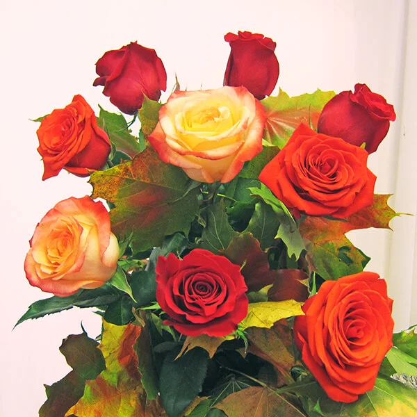 Выигрышное сочетание роз трех оттенков – нежного кремового, страстного красного и пленительного оранжевого – поможет выразить чувство благодарности и уважения. Дополненный осенними листьями букет не оставит равнодушной его получательницу