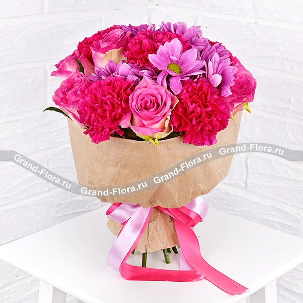 Стандартный: гвоздика малиновая - 5 шт., роза розовая - 4 шт., хризантема кустовая фиолетовая - 2 шт., упаковка, лента. Примерный размер: 30Х30 см.