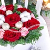 Стандартный: роза красная - 7 шт., роза кустовая розовая - 2 шт., хлопок - 2 шт., шарики - 3 шт., ель, оазис, коробка.